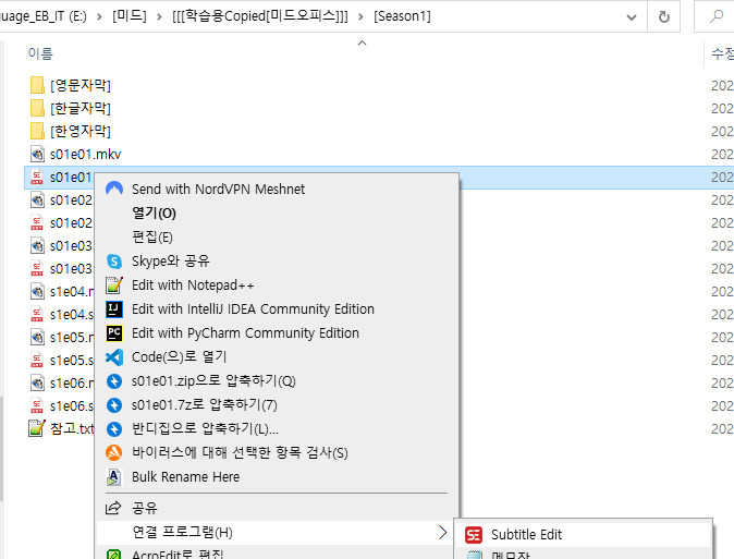subtitleEdit 설치후, 탐색기에서 자막파일을 선택하고, 우클릭해서 subtitleEdit를 실행합니다.